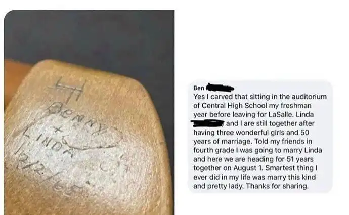 "Я выцарапал эту надпись в аудитории школы Централ Хай в первый год учебы. Вскоре я перешел в школу LaSalle. Мы с Линдой по-прежнему вместе, в нашем активе - три чудесные дочери и 50 лет брака. Я еще в школе сказал друзьям, что женюсь на Линде, и вот 1 августа мы отметим 51 год вместе. Женитьба на этой прекрасной доброй леди - лучшее, что я сделал в жизни. Спасибо, что поделились фото!"