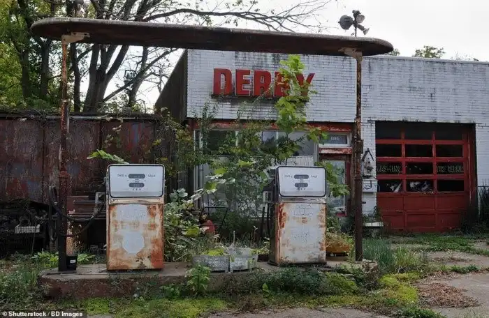 Заброшенная автомобильная заправка и станция техобслуживания Derby в городе Сент-Джеймс, штат Миссури, США