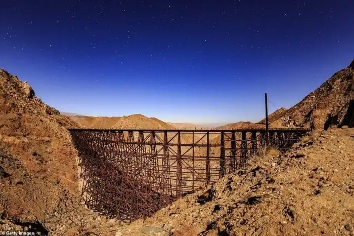 Эстакада Козьего Каньона - одна из самых больших отдельно стоящих деревянных эстакад в мире, при длине 229 м и высоте 61 м. Ее построили в 1933 году как часть Восточной железной дороги Сан-Диего и Аризоны после обрушения одного из туннелей через ущелье Карризо. Из-за опасности и пустынной местности вокруг железную дорогу вскоре прозвали "невозможной". Последний поезд, пересекавший удаленную эстакаду, прошел здесь в 2008 году. Сегодня это популярное место для экстремальных туристов - добраться до эстакады требует подготовки, а опасный переход через нее недавно запретили законом.