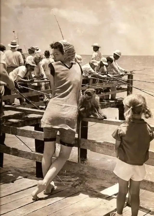 Девушка в купальнике старого образца с обезьянкой на пляже, 1949 год.