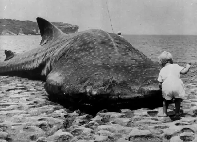 Маленький ребенок и гигантская китовая акула выброшенная на побережье Австралии, 1965 год.