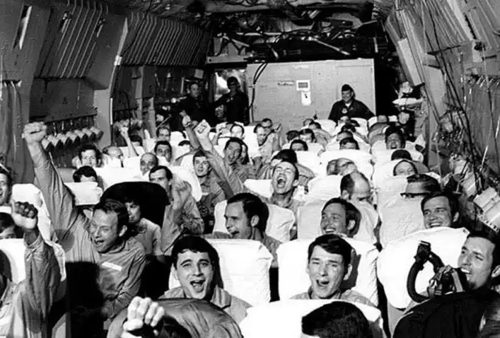 4. Освобожденные военнопленные радуются в тот момент, когда их самолет взлетает из Ханоя, 12 февраля 1973г. во время операции " Возвращение домой "