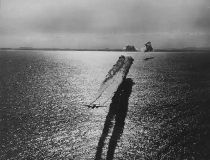 6. Американский бомбардировщик North American B-25 Mitchell ставит дымовую завесу, которая должна обеспечить скрытность подхода группы американских ударных самолётов для атаки по японским береговым объектам; Тихоокеанский ТВД; 1943-1945 гг