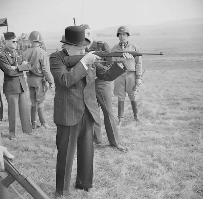 12. Премьер-министр Великобритании Уинстон Черчилль стреляет из американского самозарядного карабина М1 в окрестностях Солсбери, Британия, 23 марта 1944 года