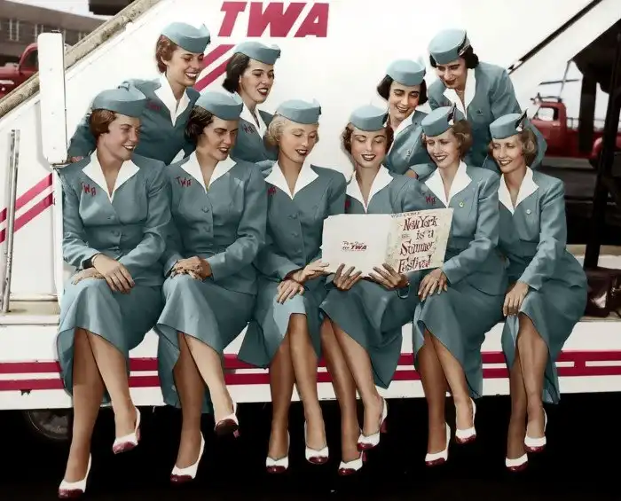 24. Пять пар стюардесс-близняшек снимаются в рекламе авиакомпании «Trans World Airlines». США. 1956 г.