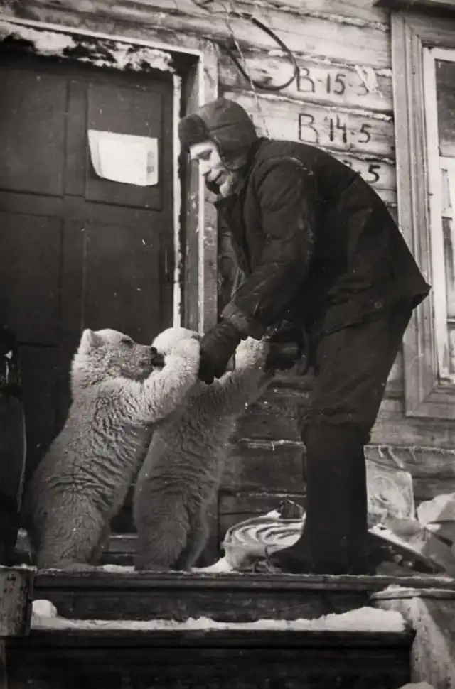 Сотрудник метеостанции кормит осиротевших медвежат, Новая Земля, 1970 год.