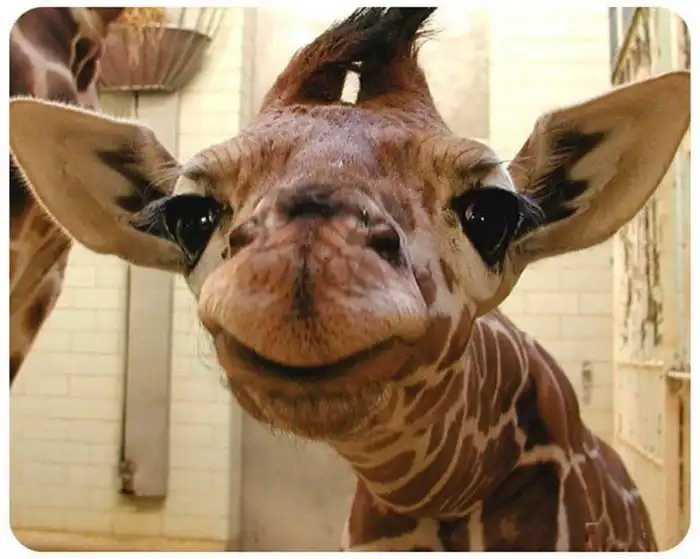 Это самая первая фотография крошечного жирафа. Он только недавно появился на свет и уже начал изучать все, что происходит вокруг. Конечно, под пристальным наблюдением мамы и зоозащитников