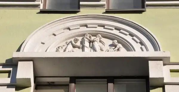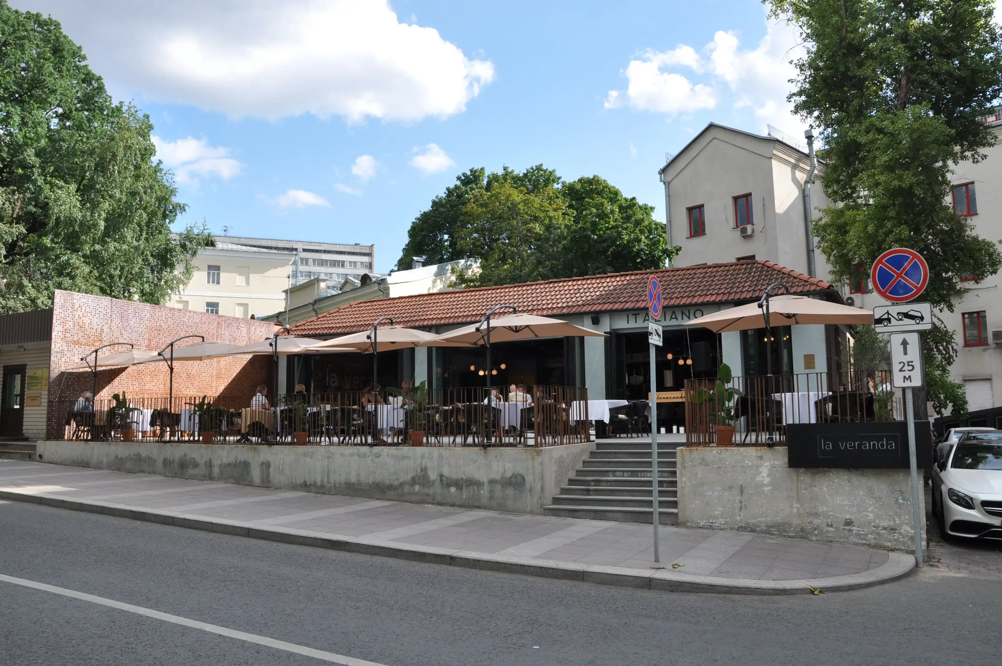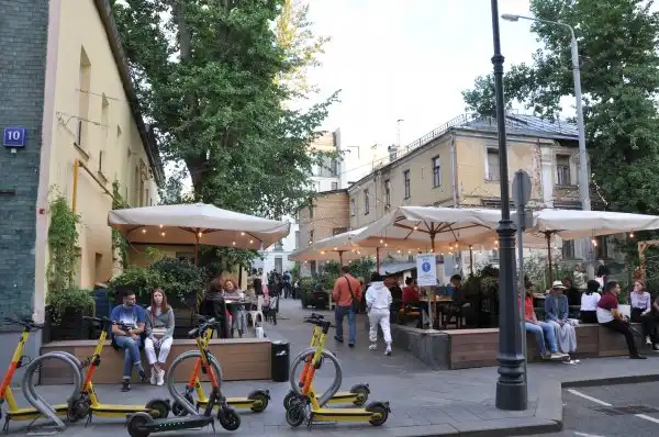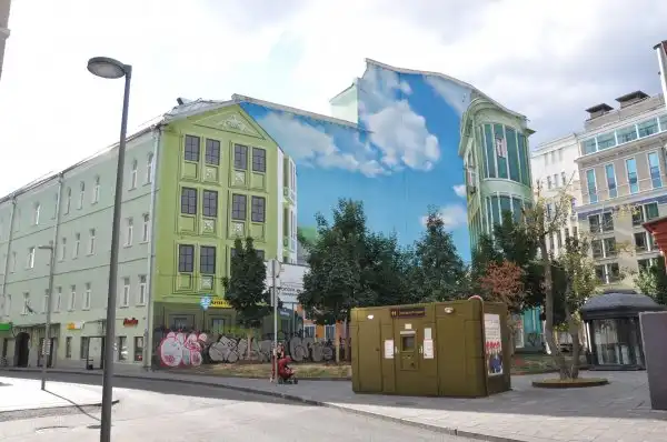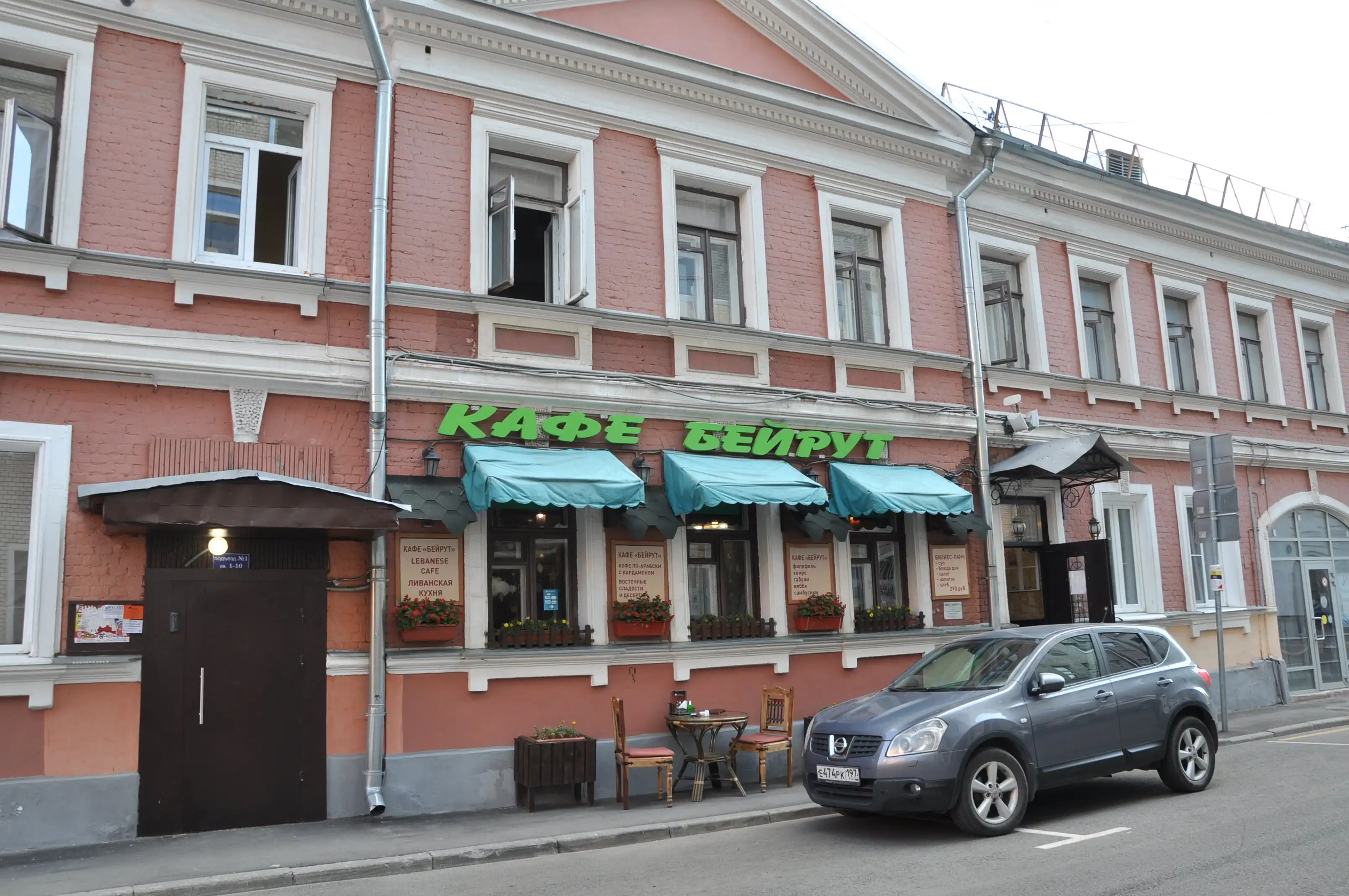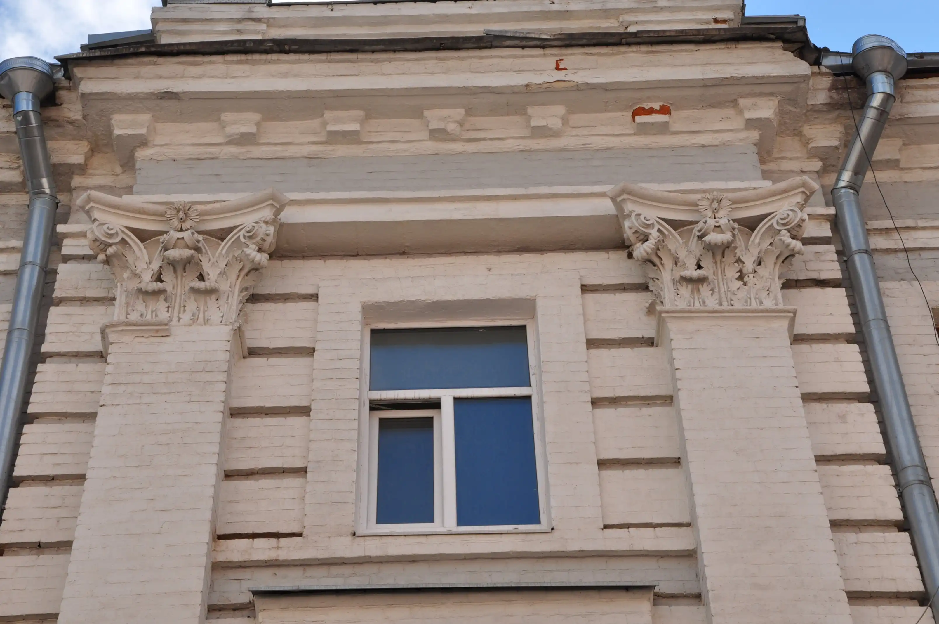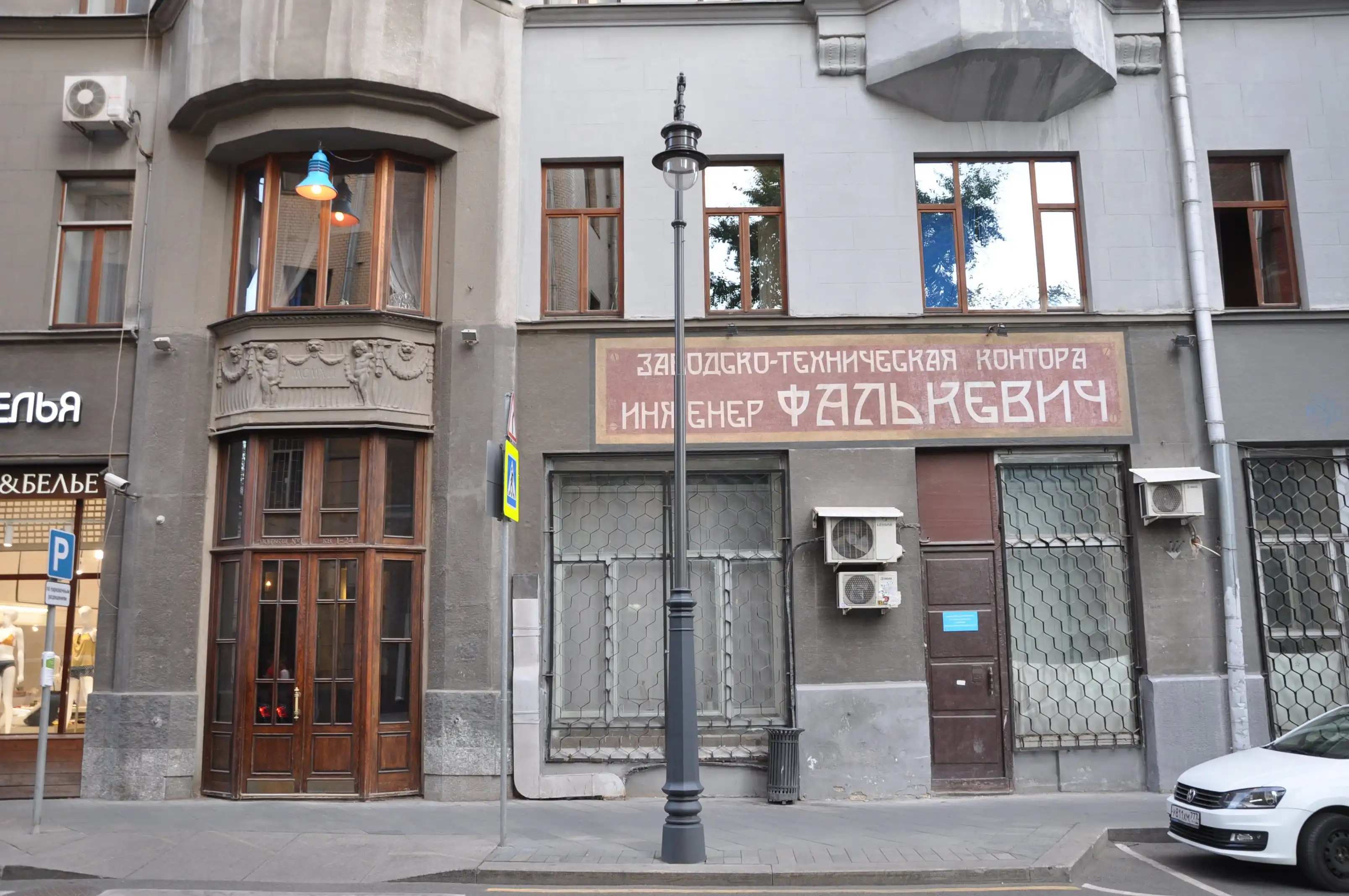 Оформление глухого бокового фасада дома. На переднем плане – городской туалет. Посетить его стоит 60 рублей. Оплата банковской карточкой. Таких в центре Москвы достаточно много, особенно на бульварах.