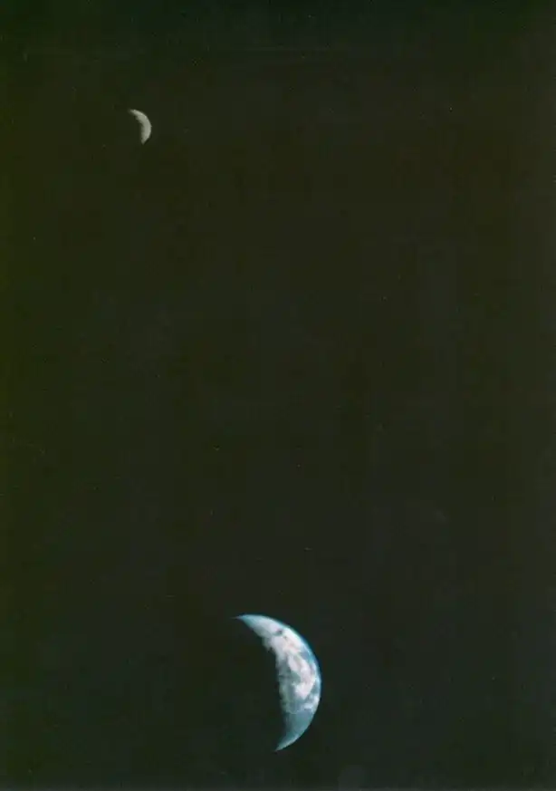 7. Первая в истории фотография Луны и Земли в одном кадре. Сделана американским космическим аппаратом «Voyager-1». 1979 г.