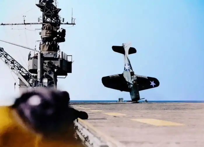 13. Пикирующий бомбардировщик Douglas SBD “Бесстрашный” балансирует на носу после аварийной посадки на палубу авианосца в Тихом океане, 1943 год.
