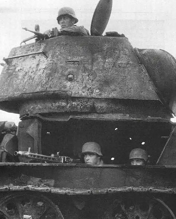 27. Немецкий пулеметный расчет использует подбитый танк Т-34 как ДОТ, 1942 г.