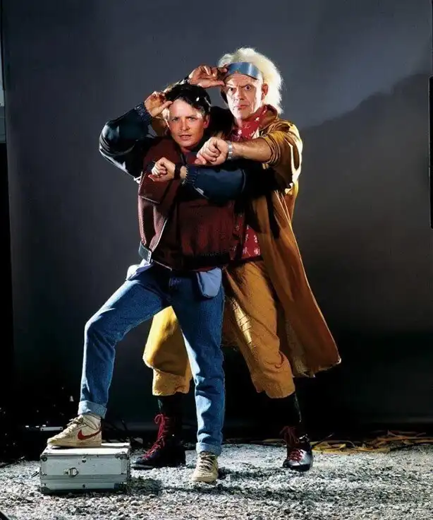 36. Майкл Дж. Фокс и Кристофер Ллойд позируют для плаката к фильму «Назад в будущее II». 1989