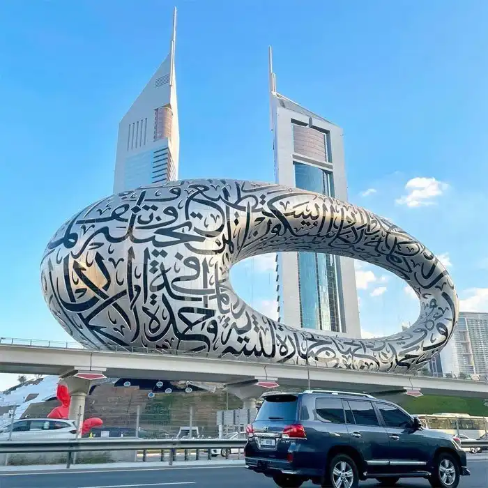 Музей будущего должен открыться в конце этого года. Ожидается, что он станет новой достопримечательностью ОАЭ, расположенной всего в семи минутах езды от небоскреба Бурдж-Халифа. Здание в форме торуса спроектировалп архитектурная фирма Killa Design. Его высота составляет 77 метров, и оно покрыто арабской каллиграфией. Надписи не случайны: это строки из стихотворения правителя Шейха Аль Мактума.