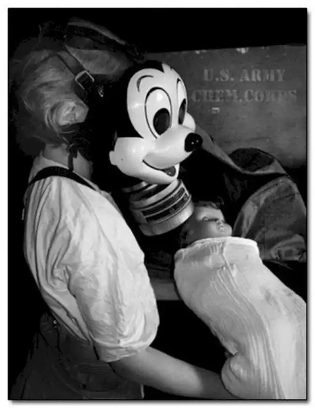 Девочка в противогазе Disney Mask. Во время Второй Мировой Войны были представлены дружественные детские противогазы от Диснея.