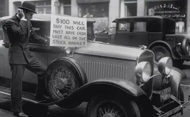 Мужчина пытается продать машину после обвала на фондовой бирже во время Великой Депрессии, 1929 год. Надпись «Отдам за 100$, наличкой, потерял всё на бирже»
