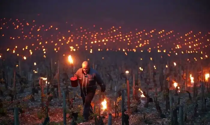 14. В холодные ночи французские фермеры спасают свои виноградники с помощью огня
