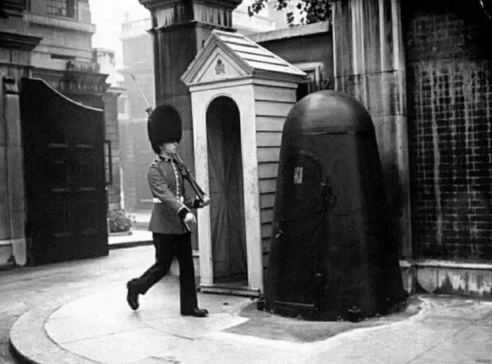 20. Солдат королевской гвардии с индивидуальным бомбоубежищем рядом с сторожевой будкой, Лондон, 1940 год