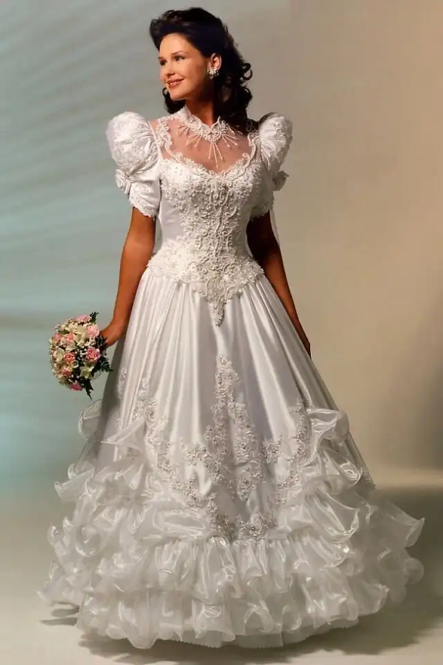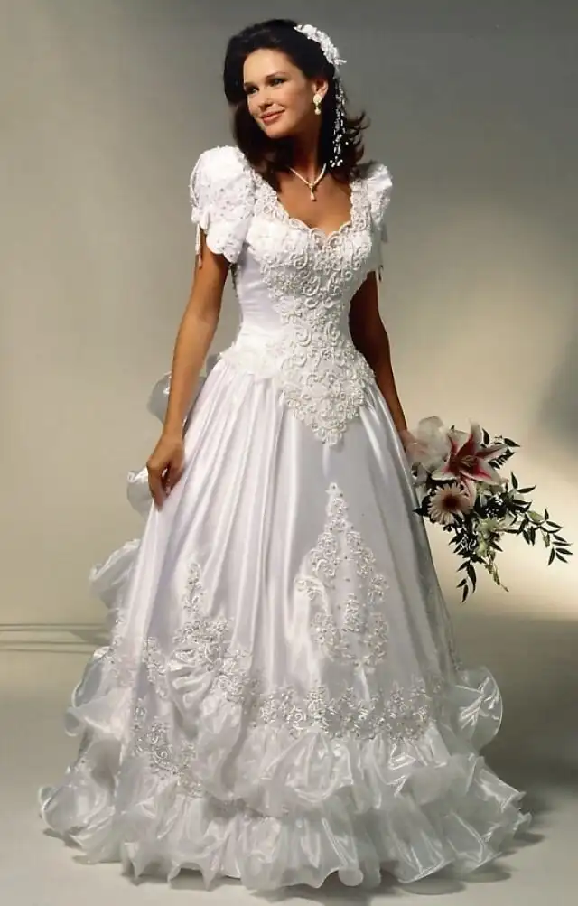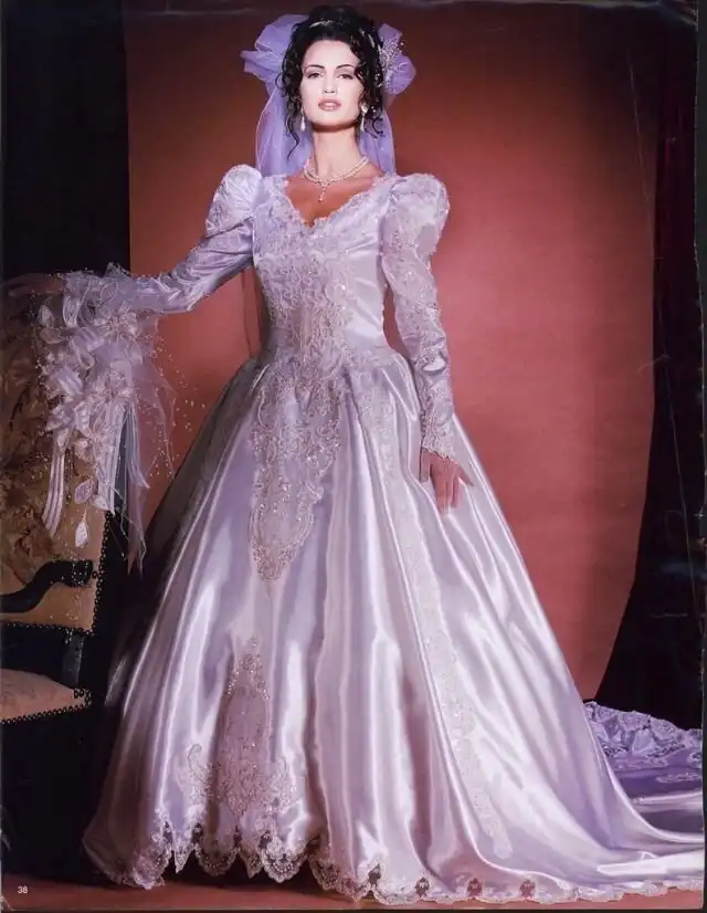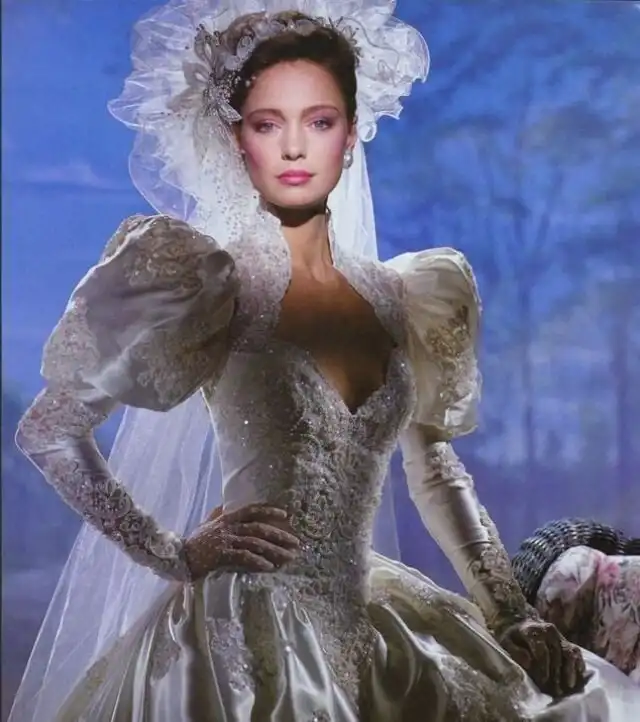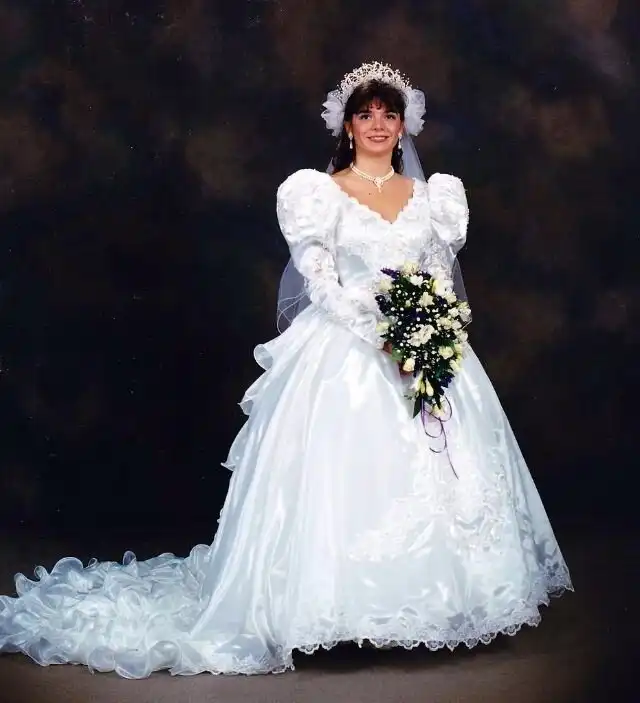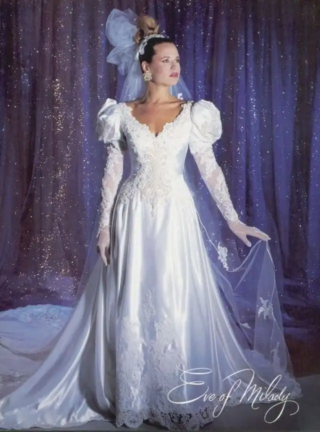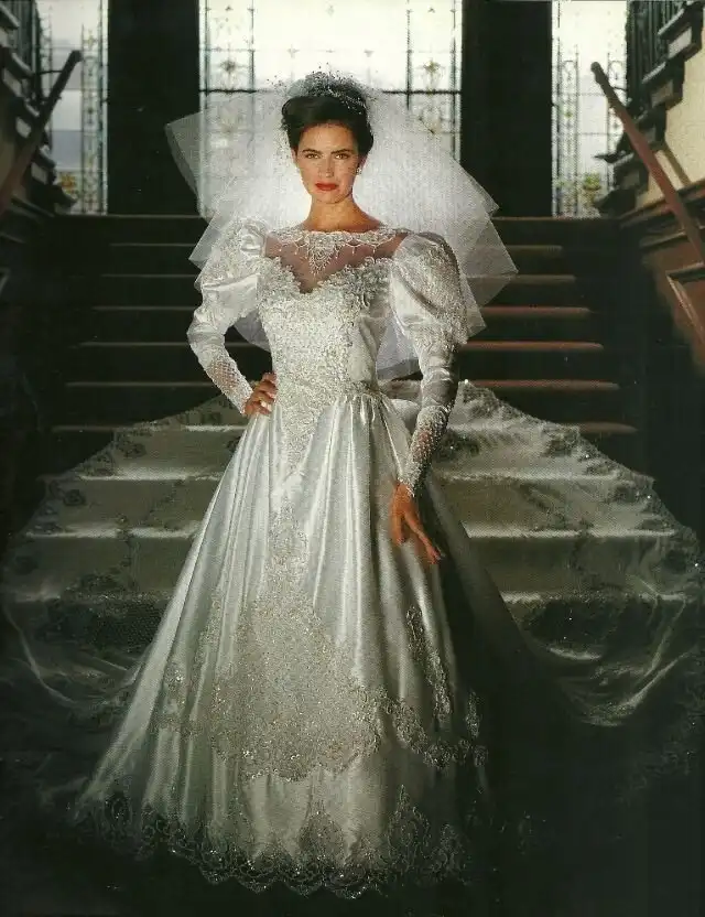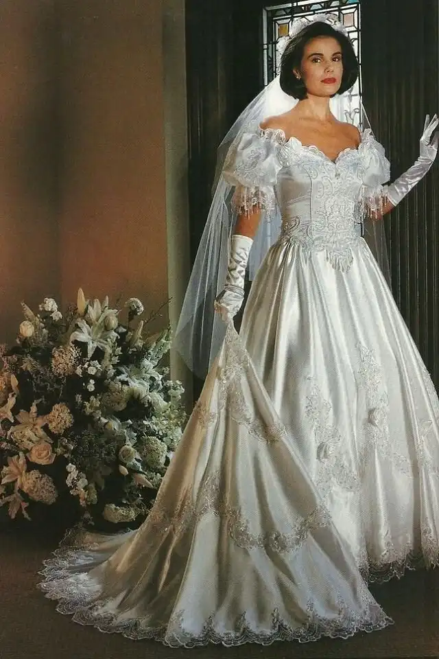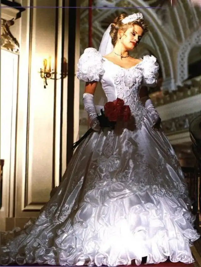 1990-е были эпохой, когда минималистичный дизайн постепенно начинал входить в моду, но свадебные платья все еще оставались очень торжественными и пышными, со множеством украшений, аппликаций, кружева и складок, многослойными юбками, блестящими тканями, шлейфами и непременной фатой.