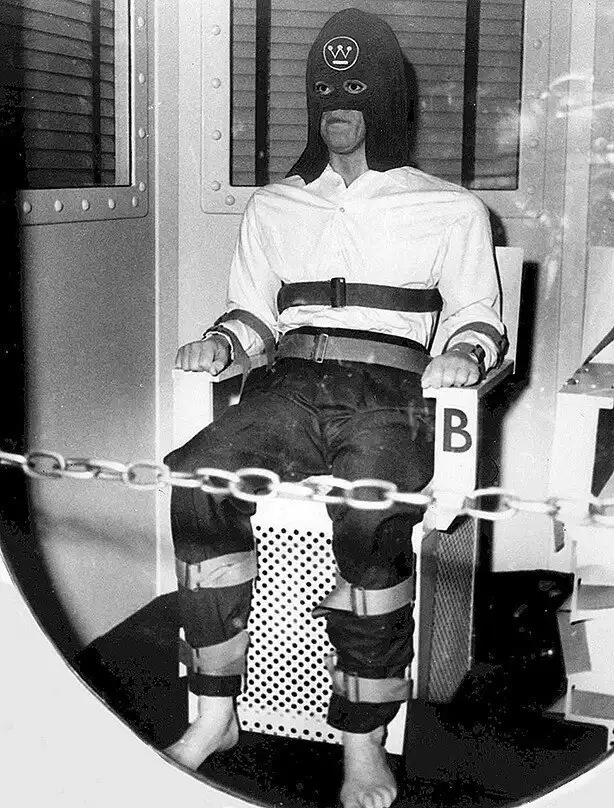 29. Приговоренный к смерти в газовой камере. На лбу рекламный логотип Westinghouse Electric Company.США, 1939 год