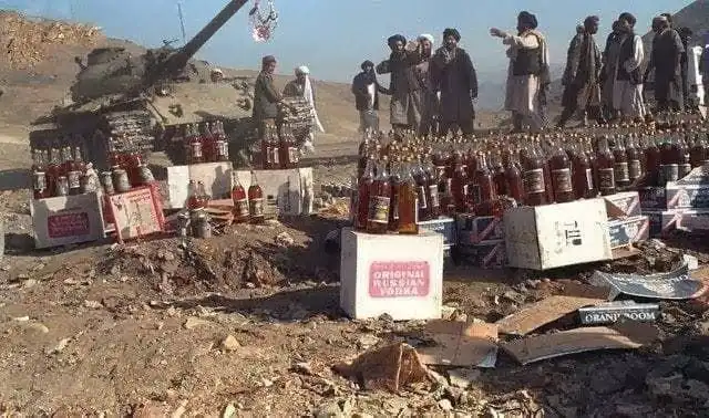 Талибы* (запрещены в РФ) давят алкоголь, захваченный при взятии Кабула, Афганистан, 1996 год.