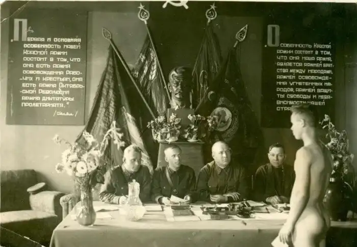 29. Призывник в армию перед призывной комиссией. СССР. 1930-е