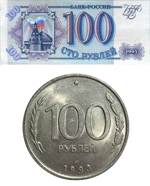 100 рублей. Хоть монетой, хоть купюрой. В начале 1993-го (год производства) эта сумма ещё имела хоть какую-то ценность, но ближе к 1997-му расплатиться одной монетой/бумажкой можно было разве что за жвачку в киоске. И то могло не хватить.