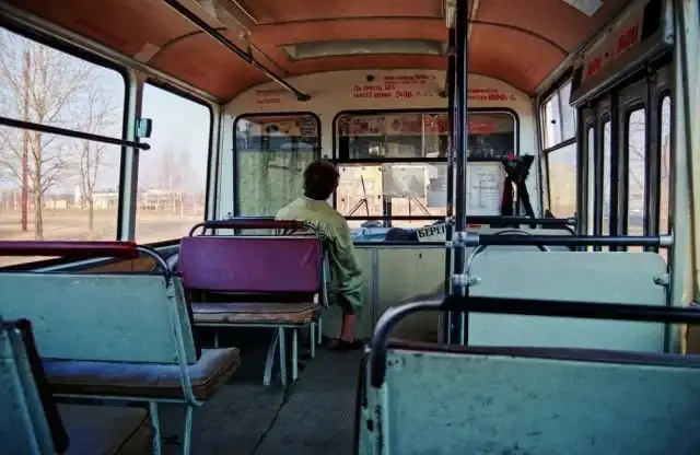 Салон автобуса ЛиАЗ-677, который в девяностые ездил практически в каждом городе. Кстати, видно, что написаны две цены: старая (до деноминации 1998 года) и новая, после урезания цен в 1000 раз.