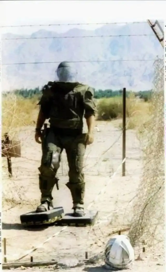 Израильский сапёр возвращается после разминирования на территорию своего государства с приграничной с Иорданией полосы. 18 октября 1994 года.