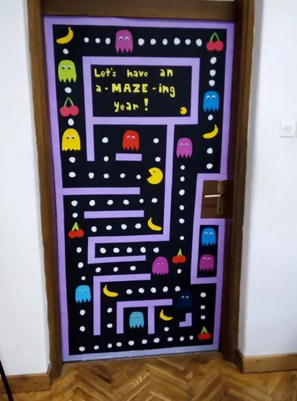 Дверь в моём классе украшена игрой Пакман. Это всегда поднимает мне настроение перед занятиями