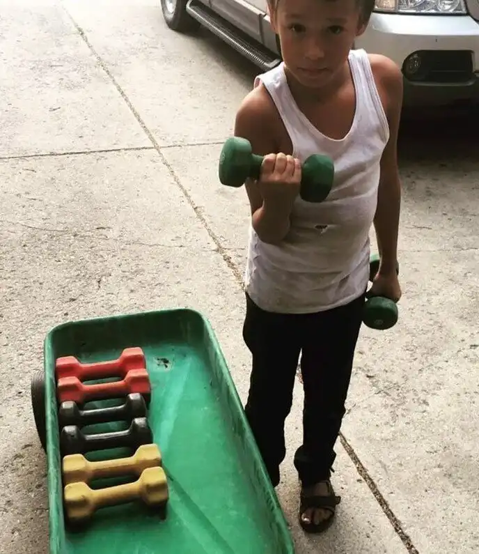 "Этот мальчуган - мой сосед. У него нет отца, и он часто заезжает на велике ко мне в гараж. Недавно показал ему гантели, и теперь занимается. Просто красавчик!"