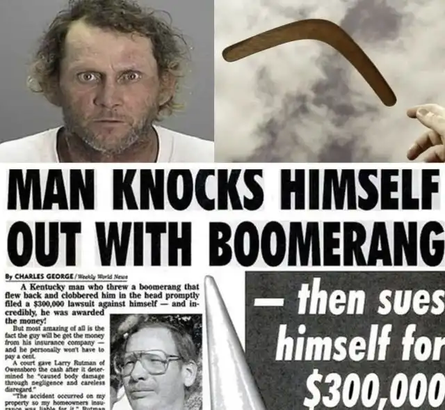В 1996 году американец Ларри Рутман кинул бумеранг, который вернулся и ударил его по голове. Ларри подал сам на себя иск о возмещении ущерба на сумму 300 000 долларов и выиграл дело.