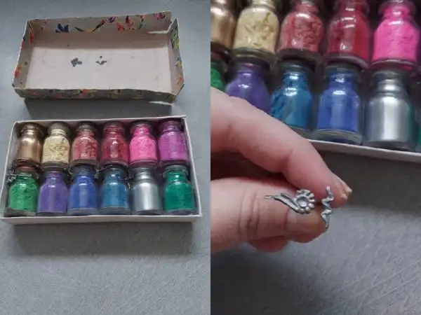 Маленькие колбочки с цветной пудрой и металлические штампы