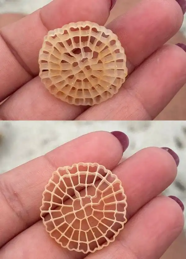 Круглый предмет (3 см), сделанный из ячеек (как в ульях) из материала, похожего на пластик. Найден на пляже в Италии