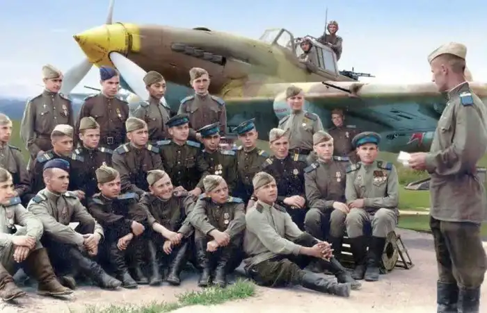 Во время Корейской войны полк подготовил и перегнал в Даньдун в декабре 1950 г., 26 штурмовиков Ил-10 для восполнения потерь северокорейских ВВС. Летный состав возглавлял капитан Василий Иванович Калинчиков, техников – старшина Алтай Яковлевич Дадуев ( на фото стоит третий слева).
