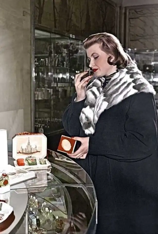 16. Покупательница у прилавка парфюмерного магазина в Охотном Ряду выбирает духи. СССР, Москва, 1958 год. Фото: Василий Малышев .