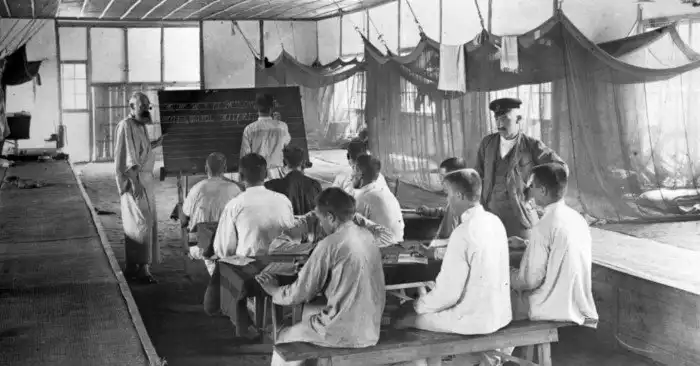 17. Подполковник Саблуков обучает грамоте солдат в лагере в Фукуоке. Япония. 1904-1905 гг. Фото: РГАКФД