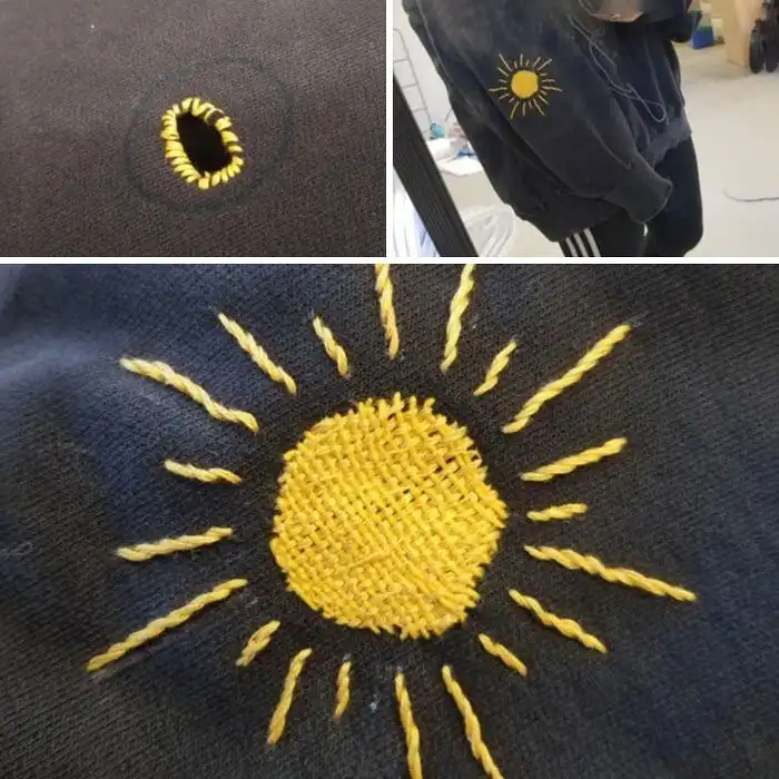 3. "Случайно капнула отбеливателем на новую толстовку. Это мой первый опыт вышивки!"