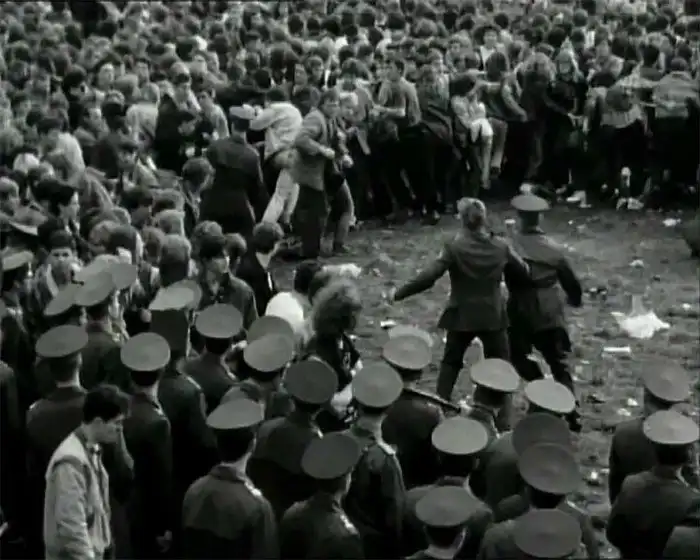 Рассказы очевидцев разноречивы и зачастую полностью не совпадают. Что вполне естественно – огромное поле, огромная толпа людей с разными оценками происходившего и, соответственно, разное отношение к событиям. Кто-то уверен, что беспорядки были спровоцированы слишком агрессивными действиями силовиков. «Космонавты-омоновцы» буквально вламывались в толпу и дубинками месили всех подряд. Несколько милиционеров грубо скинули девчонку с парнем с технической вышки и сами уселись смотреть концерт. Разъяренная толпа закидала их стеклотарой.