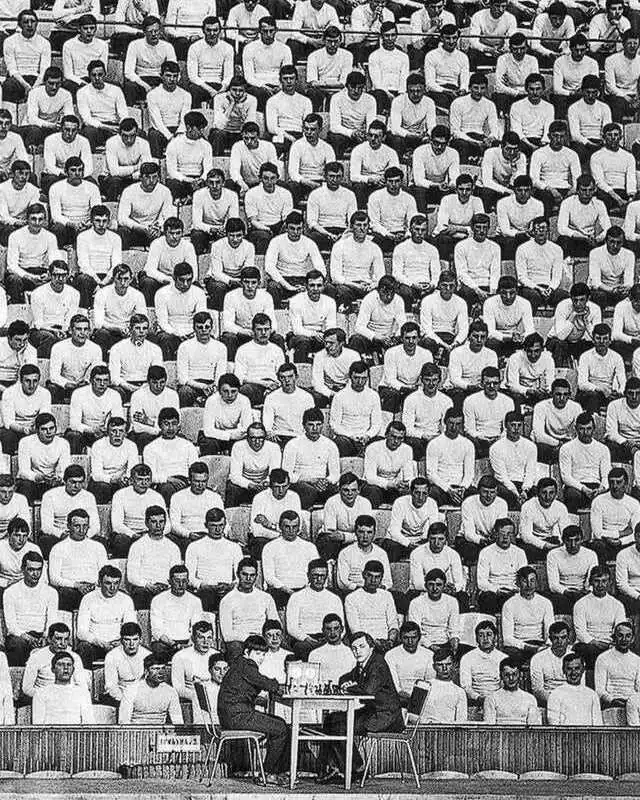 Чемпион мира по шахматам Анатолий Карпов во время показательной партии, сыгранно им на XVIII съезде ВЛКСМ в 1978 году.