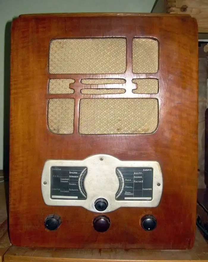 Что из себя представляет ламповый радиоприемник: шасси с деталями, на которых собрана вся электронная схема, кнопки включения и переключения диапазонов, ручки регулировки звука и настройки на радиостанции, несколько динамиков.