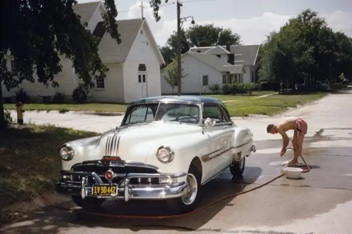 19. Мужчина моет свой Pontiac Catalina, Флорида, 1953 год