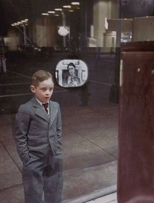21. Мальчик впервые смотрит телевизор в окне магазина приборов. Нью-Йорк, 1948 год