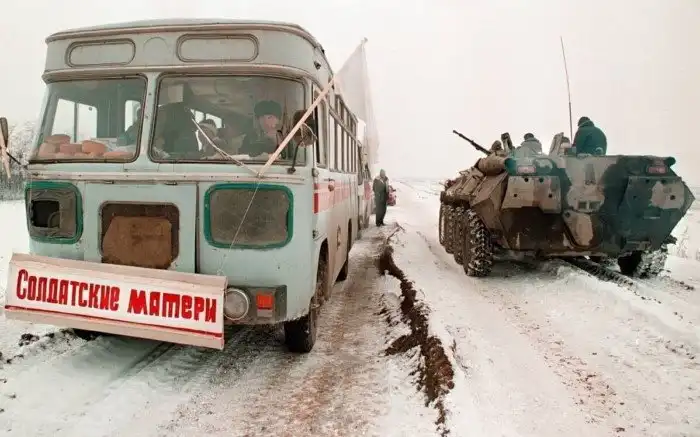 30. На дороге войны: автобус с матерями военнослужащих, направляющийся в Грозный, 1996 год