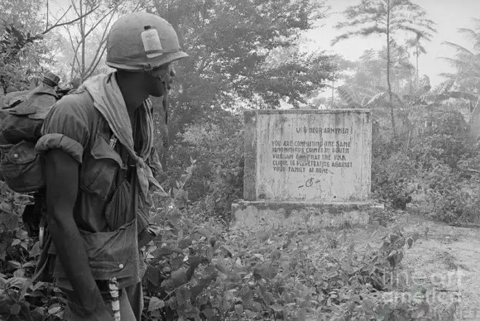 Оно гласит: «Негритянские военнослужащие армии США, вы совершаете те же позорные преступления в Южном Вьетнаме, которые Ку-клукс-клан совершает против ваших семей на родине». 1970 год