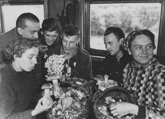32. Молодежь в электричке с дарами подмосковных лесов. СССР. 1950-е. Фото Михаила Грачёва