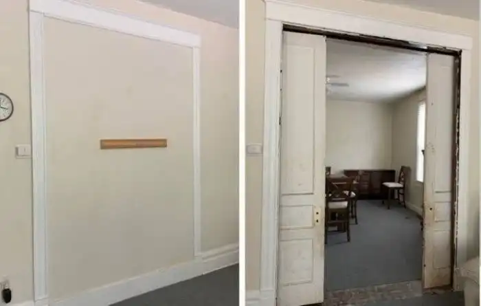 «Эти раздвижные двери были спрятаны за гипсокартоном. Они разделяют гостиную и столовую»