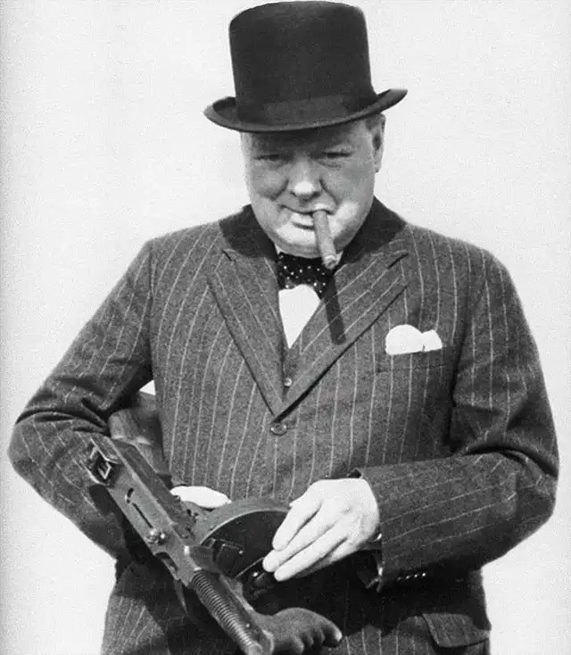 Уинстон Черчилль с сигарой и автоматом Томпсона, 1940 год