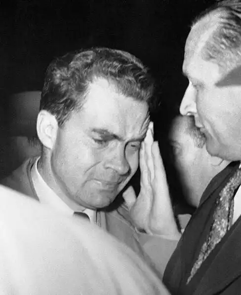 Стоит пояснить, что Никсон на этом фото запечатлён после разговора с Дуайтом Эйзенхауэром, когда Эйзенхауэр сообщил ему, что не отказывается баллотироваться вместе с ним после скандала (в 1952-м Эйзенхауэр - кандидат в президенты, Никсон - его вице-президент). А скандал связан с незаконными пожертвованиями кампании Никсона. В связи с обвинениями Никсон выступил по телевидению с "Речью о Чекерсе". Никсон заявил, что принял один незаконный подарок, этот подарок - пёс Чекерс, которого полюбила вся семья, и которого он не отдаст, даже если ему придётся отказаться от предвыборной гонки.