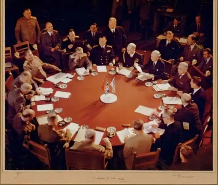 Сталина можно увидеть слева, Черчилль сидит к нам спиной, Гарри Трумэн пятый справа от Сталина.