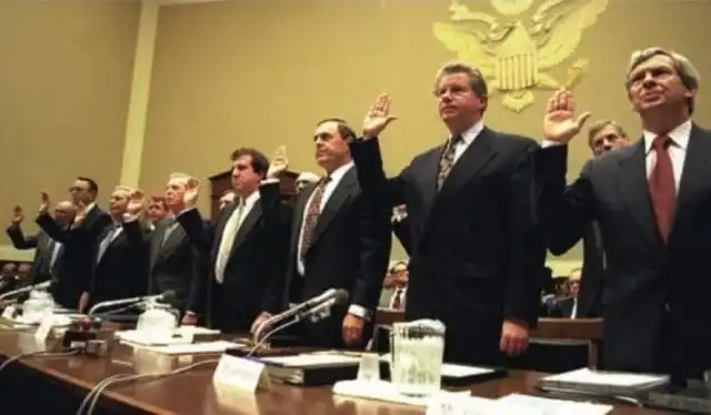 Генеральные директора семи основных табачных корпораций США заявляют под присягой, что никотин НЕ вызывает привыкания, США, 1994 год.